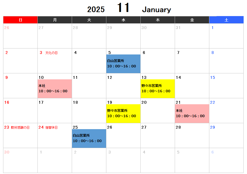 白山営業所 11月5日(水)・25日(火) 地図はこちら